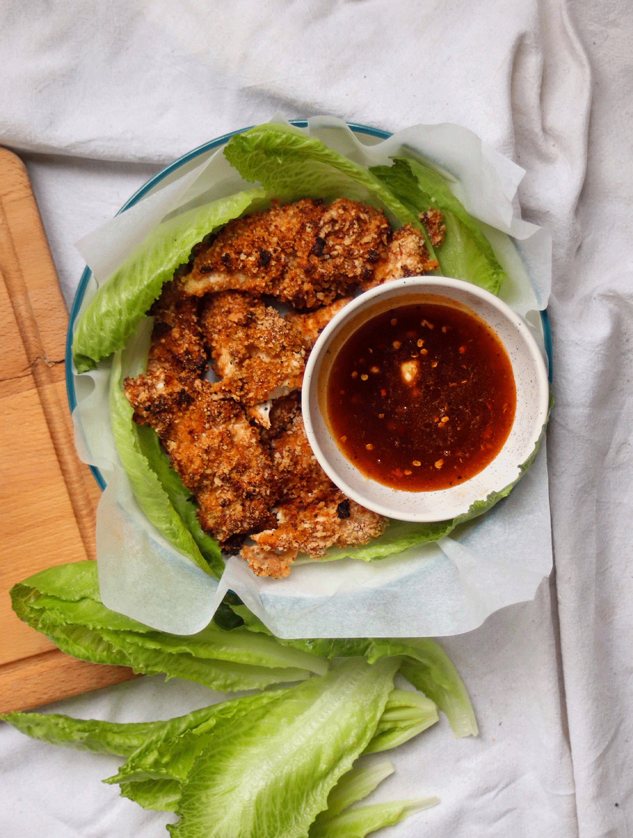 Coupez les blancs de poulet en plus petites aguillettes. Marinez le poulet dans la sauce à la moutarde une dizaine de minutes.